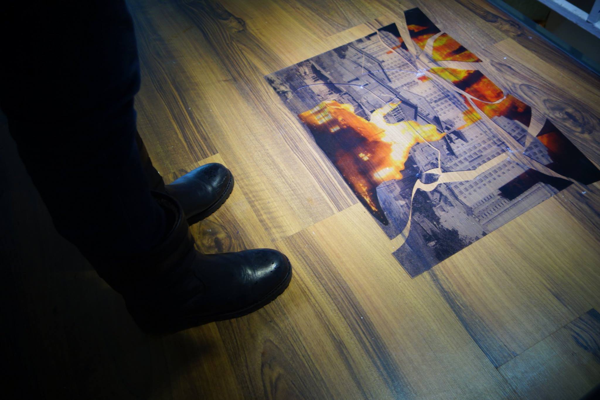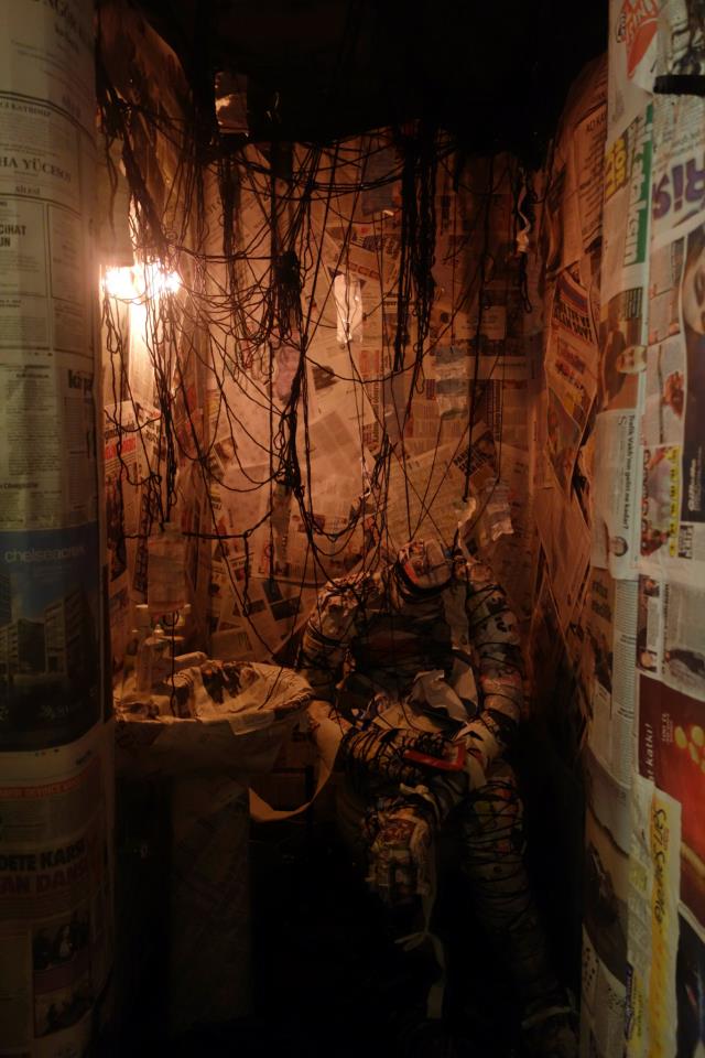 Kayde Anobile’nin üzeri balmumu akıtma manzara tablosu yeri ve zamanı bilinmeyen tekinsiz bir dünyanın kapılarını aralarken, Dilek Gökçen Açay, insanın modernite sonrası çatışmalarını ve keÅŸif nesnesine dönüÅŸümünü adeta o dönemden kalma bir sunum tekniÄŸiyle çözümledi.